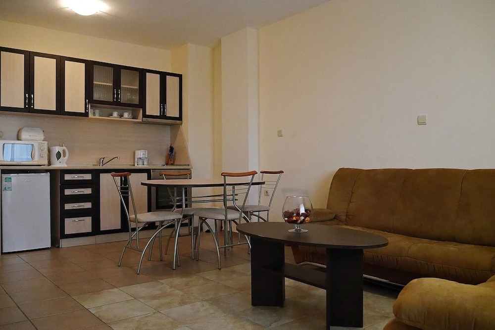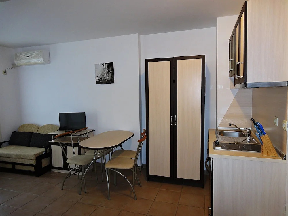 Про расположение:Отель расположен не прямо возле моря,но рядом много кафе, магазинчиков, недалеко автобусная остановка. До Южного пляжа 7-8 минут. До Северного чуть дольше, минут 12-15, есть маленький Каменный пляж, он без спасателей, в бухточке, если идти 20-25 минут в сторону Равды, есть чудная бухточка, где всегда зеленый флаг, правда, там много водорослей. Про хозяев:Совершенно чудесные люди, общительные, дружелюбные. Подарили нам банку маринованных огурцов и полторушку ракии -все собственного производства. Про сам отель и номер: Самое главное -чистота. Убирался номер строго ежедневно. Полотенца менялись через день. Белье и полотенца не новые, но чистейшие. Симпатичный холл. Из недостатков -подушки не очень и шкаф без дверей. Про еду: Так как концепция отеля не включает питание, мы имели возможность каждый день есть в новом месте. Рекомендуем "Старый орех", расположенный на той же улице. Потом, ресторанчик в морском стиле, по моему "Иванофф", ну, и конечно, обязательна к посещению "Бяла роза". Возмите там креветки в панировке. Это рестораны с демократичными ценами. Соотношение в отеле цена-качество, по моему, идеальное.