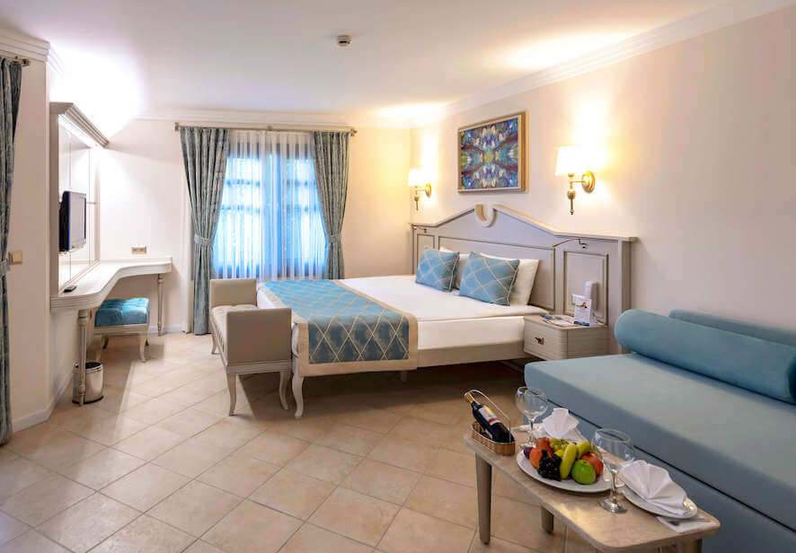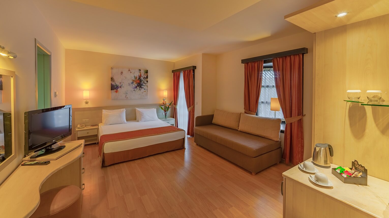 Однокомнатный номер с видом на море, подходит для размещения 2-х человек на двуспальной или 2 односпальных кроватях, есть балкон. В комплектации кондиционер, телевизор, мини-бар, сейф, чайник и принадлежности для чая/кофе. Ванная комната с ванной, феном, тапочками, банными принадлежностями.